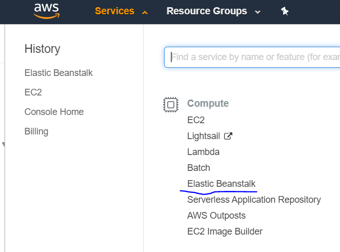 AWS 콘솔에 root 계정으로 접속해서 메뉴창에 Elastic Beanstalk를 선택한다. Beanstalk는 EC2 서버 기반의 웹 애플리케이션 관리 서비스로, AWS의 여러 서비스들을 쉽게 연결할 수 있고 웹 콘솔에서 모니터링이 가능하다는 장점이 있다.