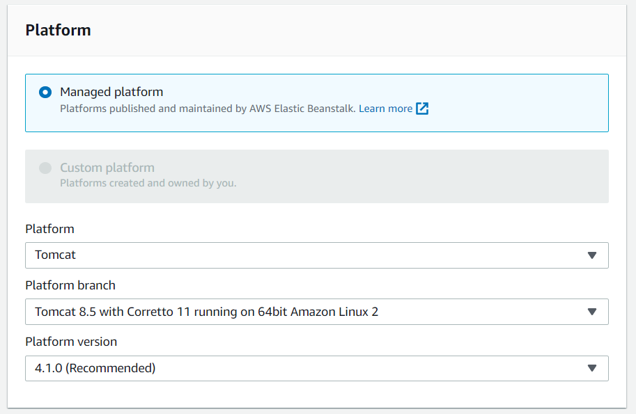 여기서 중요한 단계는 Platform을 정하는 부분이다. 지금 사용하는 예제는 Tomcat 서버를 사용하기 때문에 Managed Platform을 클릭하고 적정한 버전의 Tomcat을 선택한다.