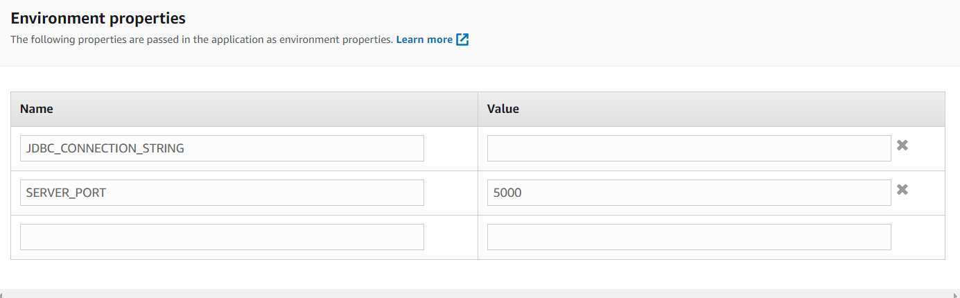 Elastic Beanstalk는 기본적으로 5000 포트에서 서버를 돌리고, Spring은 8080 포트에서 돌린다. 이 차이 때문에 에러가 생길 수 있으니 Beanstalk 환경 콘솔 좌측 메뉴의 Configuration 페이지에서 변수를 추가해야 한다. Configuration 페이지에 들어가면 Software 박스 안의 편집 버튼을 클릭한다. 맨 밑으로 스크롤하면 환경 변수를 추가하는 페이지가 나온다. 여기에 SERVER_PORT에 5000인 property를 추가한다.